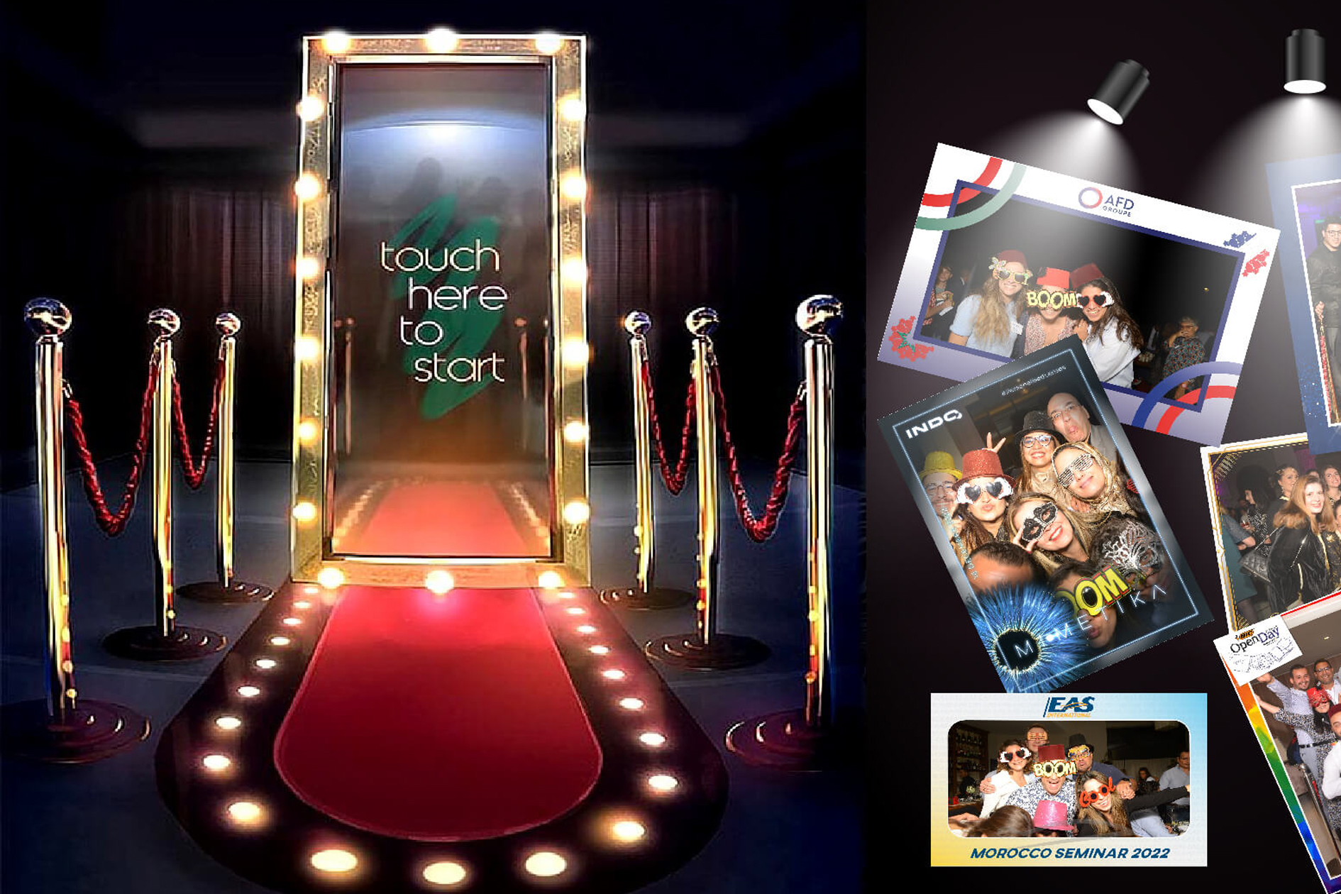 Ajoutez une touche de fun avec nos photobooths. Des cabines photo interactives pour capturer des souvenirs amusants et spontanés, offrant à vos invités des souvenirs instantanés et personnalisés de votre mariage.